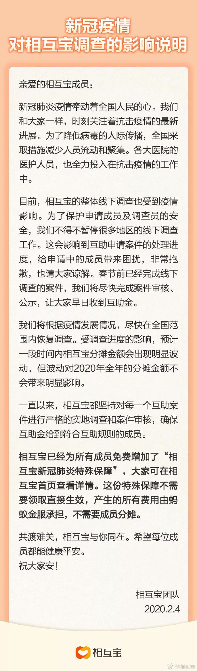 4日,支付宝上的大病互助社区相互宝的公告显示:在全国疫情防控工作下,为保护相互宝申请成员及调查人员的安全,相互宝不得不暂停部分地区的线下调查工作,互助案件的整体调查、审核进度将受到影响。 按照相互宝的规则,相互宝会对每一个互助案件进行实地调查和严格审核,确保互助结果公平公正。 公告称,春节前已完成线下调查的案件,相互宝将会尽快进行案件审核,然后公示,让申请人尽快收到互助金。后续,相互宝将根据疫情发展情况,尽快在全国范围内恢复调查。 以下为相互宝公告全文: 新冠疫情对相互宝调查的影响说明 亲爱的相互宝成员: 新冠肺炎疫情牵动着全国人民的心。我们和大家一样,时刻关注着抗击疫情的最新进展。为了降低病毒的人际传播,全国采取措施减少人员流动和聚集。各大医院的医护人员,也全力投入在抗击疫情的工作中。 目前,相互宝的整体线下调查也受到疫情影响。为了保护申请成员及调查员的安全,我们不得不暂停很多地区的线下调查工作。这会影响到互助申请案件的处理进度,给申请中的成员带来困扰,非常抱歉,也请大家谅解。春节前已经完成线下调查的案件,我们将尽快完成案件审核、公示,让大家早日收到互助金。 我们将根据疫情发展情况,尽快在全国范围内恢复调查。受调查进度的影响,预计一段时间内相互宝分摊金额会出现明显波动,但波动对2020年全年的分摊金额不会带来明显影响。 一直以来,相互宝都坚持对每一个互助案件进行严格的实地调查和案件审核,确保互助金给到符合互助规则的成员。 相互宝已经为所有成员免费增加了“相互宝新冠肺炎特殊保障”,大家可在相互宝首页查看详情。这份特殊保障不需要领取直接生效,产生的所有费用由蚂蚁金服承担,不需要成员分摊。 共渡难关,相互宝与你同在。希望每位成员都能健康平安。 相互宝团队 2020.2.4 |