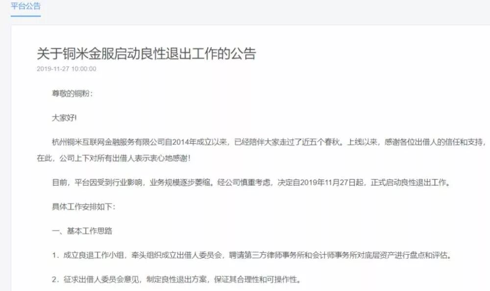 11月27日,杭州P2P平台铜掌柜发布公告,宣布由于平台因受到行业影响,业务规模逐步萎缩,决定良性退出。截至2019年10月,铜掌柜累计借贷金额187亿元,借贷余额8.96亿元,当前借款人28569人,当前出借人14230人。 公开资料显示,铜掌柜是杭州铜米互联网金融服务有限公司运营的互联网金融平台,成立于2014年7月,由上市公司中来股份(股票代码:300393)战略入股,获国内知名产业基金浙银资本旗下浙银钜鑫投资,系中国互联网金融协会会员单位、浙江互联网金融联盟首届理事单位、杭州市互联网金融协会理事单位。截止到2019年10月31日,铜米金服在职员工55人。 附:关于铜米金服启动良性退出工作的公告 杭州铜米互联网金融服务有限公司自2014年成立以来,已经陪伴大家走过了近五个春秋。上线以来,感谢各位出借人的信任和支持,公司得以生存发展。在此,公司上下对所有出借人表示衷心地感谢! 目前,平台因受到行业影响,业务规模逐步萎缩。经公司慎重考虑,决定自2019年11月27日起,正式启动良性退出工作。 具体工作安排如下: 一、基本工作思路 1.成立良退工作小组,牵头组织成立出借人委员会,聘请第三方律师事务所和会计师事务所对底层资产进行盘点和评估。 2.征求出借人委员会意见,制定良性退出方案,保证其合理性和可操作性。 二、工作内容 1.制定平台良退方案,与出借人委员会做好沟通和协调工作,接受出借人委员会的监督。 2.除关闭平台的发标、放款及投标等功能外,维持平台在良退期间的日常运营,登陆、查询及提现等其他操作功能不受影响,同时加开客服热线,确保平台官网及APP可访问、可联系。 3.负责出借人及其他相关各方的接待解释工作、安抚工作,以及良退过程中发生的争议纠纷协商化解工作。 4.推进良退方案的实施,具体包括出借人债权确认登记、出借人委员会筹建、底层资产盘点、逾期债权追偿和担保资产处置等。 5.成立良退工作小组,下设客户服务组、安全保障组、资产核算组、债权追讨组、技术支持组、法律援助组。 郑重承诺: 铜米金服良性退出安排是基于现状审慎考虑的结果,平台最新工作进展会定期向出借人公布,希望得到出借人的理解和支持。 铜米金服张焱及高管团队郑重承诺:不失联、不跑路、不放弃、不回避,积极主动推进良性退出工作;任何时候都坚守岗位,定期安排张焱及高管团队轮值接待,绝不退缩,切实履行职责;不为自己和他人谋取不正当利益,把出借人的权益放在首位,自觉接受出借人委员会的监督。 良退过程中,我们会遇到一些短暂性困难,希望广大出借人给予理解与支持。欢迎广大出借人对平台的良退工作给予宝贵意见,如有任何疑问,您可预约来访或通过以下方式联系我们: 官方 QQ 群: 客服服务时间:工作日9:00-20:00 /周末及节假日9:00-18:00 接待服务时间:工作日9:00-17:00 地址:浙江省杭州市余杭区良睦路1288号梦想小镇8号楼 杭州铜米互联网金融服务有限公司 2019 年11月27 日 来源:腾讯科技 |
